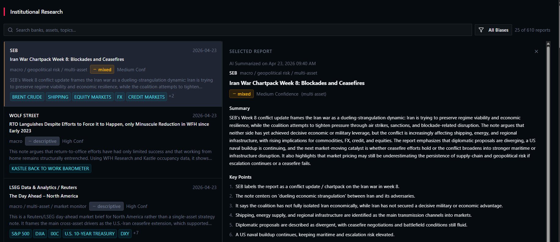 Open the feed. Scan the briefs. See the bias on every asset that matters. Click through to the original report only when something genuinely warrants a deeper read.